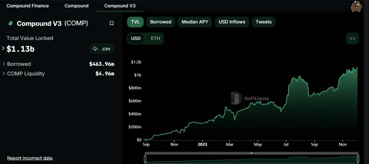 Compound III 的 TVL 在推出后一直处于一个 TVL 增加的状态, 11 月份左右突破了$ 1 b。