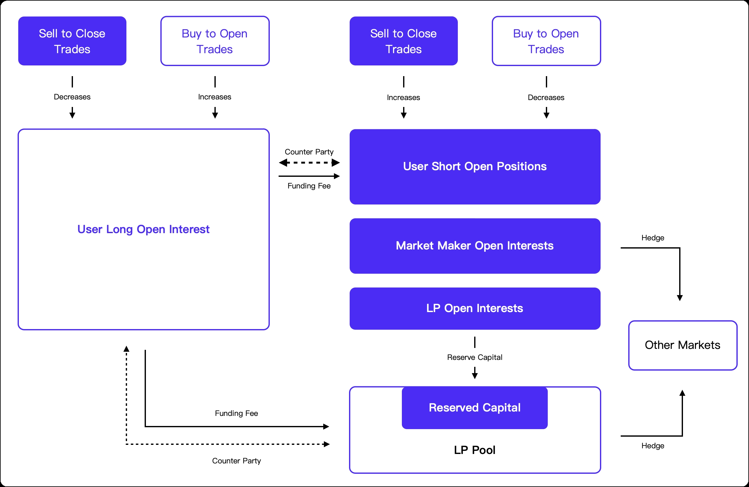 可以说MYX直击了GMX的痛点,在包括GMX在内的大多数Perp DEX中,无论多头还是空头开仓,都会占用一部分流动性。当流动性占用达到上限时,也就意味着未平仓量达到上限,只能平仓,不能开仓。MYX采用了一种独特的匹配池机制,仍然有一个流动性池作为交易员的对手方。当多头和空头仓位想等时,这个时候LP是没有作为交易员对手风险的,MYX认为此时LP不持有任何头寸。如果一直保持多空平衡的状态,那么理论上未平仓量就可以无限大。只有多空的差值部分才会使LP面临风险,而资金费用又可以激励多空保持平衡。