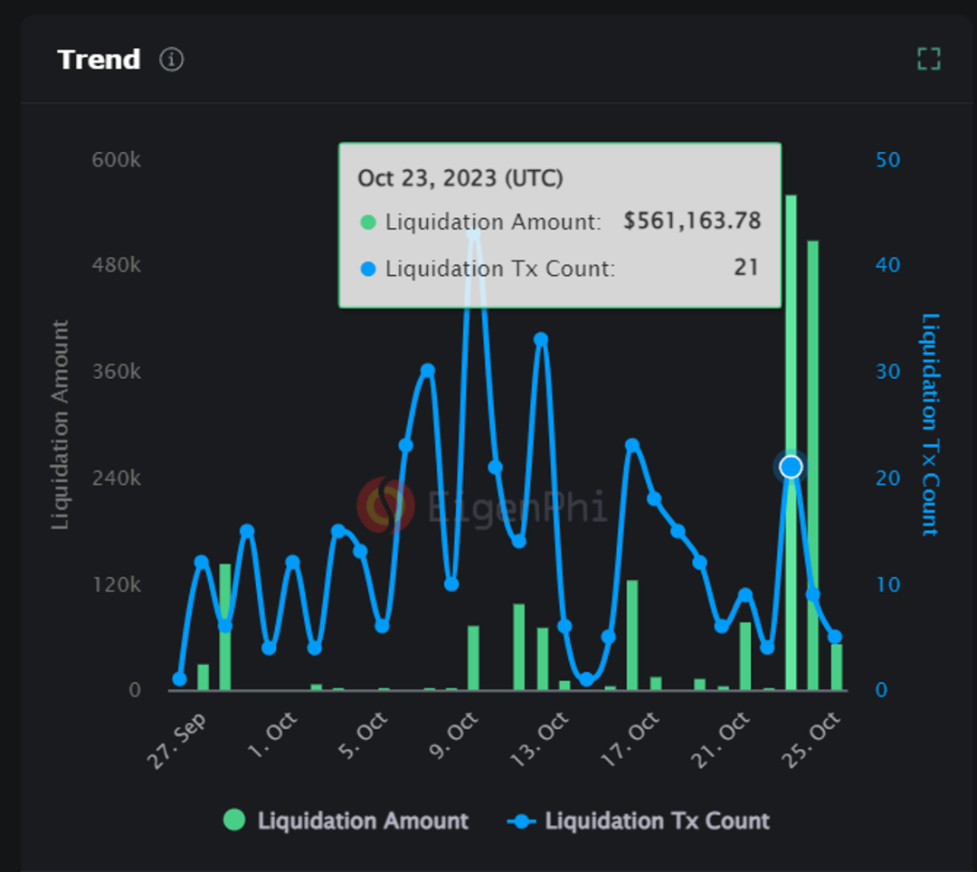 从数据可以看出,清算 MEV 不是经常发生的,大额的清算攻击通常发生在极端行情,从清算 MEV 的攻击原理出发,这点并不难理解。比如,由于 BTC 在 10 月 23 日和 24 日出现 10 个点的拉升,清算 MEV 的交易量在当日高达 $561K,明显高于其他时间。