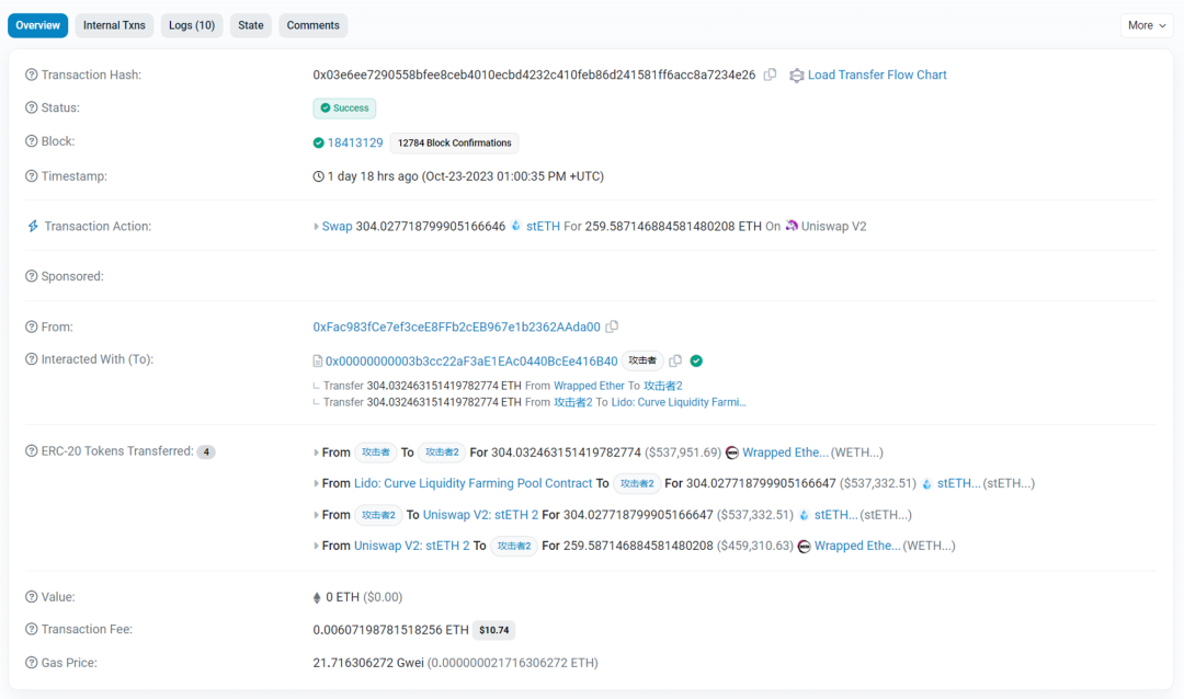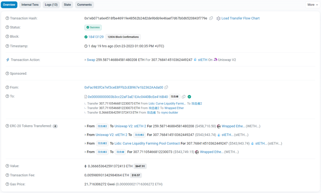 BackRun:随后,攻击者 2 通过该池子将 259.59 的 WETH 换回 stETH,得到 307.76 个 stETH(注意:较先前多出 3.76 个)。最后攻击者 2 将 stETH 利用 Lido Curve 池子以极低的滑点换出 WETH,并转回攻击者。完成获利。