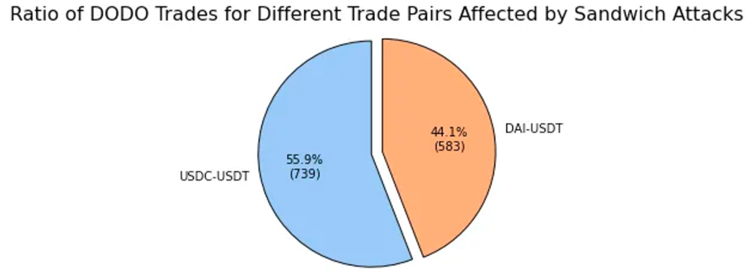 Dune 的数据显示,DODO 在 ETH 链的主要交易对是稳定币。从普适性结论我们能了解到,交易量大的矿池更容易被三明治机器人从中提取价值。这与 DODO 的数据一致,稳定币池成了 DODO 中 MEV 攻击活动发生的主要场所。根据 EigenPhi 在 《DODO: Where Does High Volume Come From?》报告中的研究:DODO 上受到三明治攻击的交易总数达到 1,322 笔,USDC-USDT 交易占 55.99 %,DAI-USDT 交易占 44.01%。