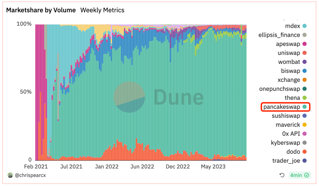 BNB 链上不同协议的市场份额,来源:Dune