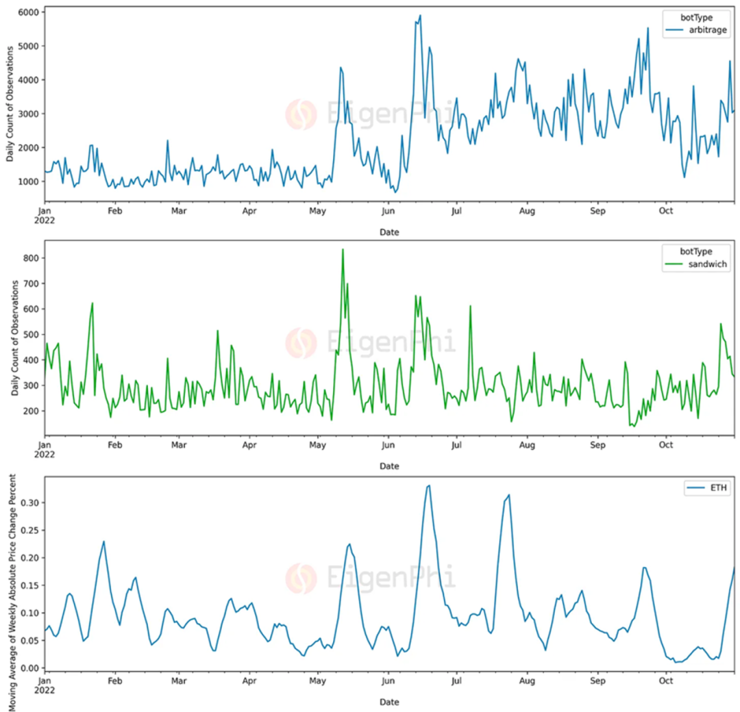 为了探究套利和三明治机器人收入的影响因素,我们探究了其收入市场价格波动的关系。EigenPhi 报告中的数据展示了 ETH 价格变化与套利和三明治活动的数量关系,如下图所示。我们可以明显观察到随着 ETH 价格波动变大,套利和三明治共计的次数也随之增加,呈现明显的正相关关系。