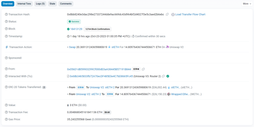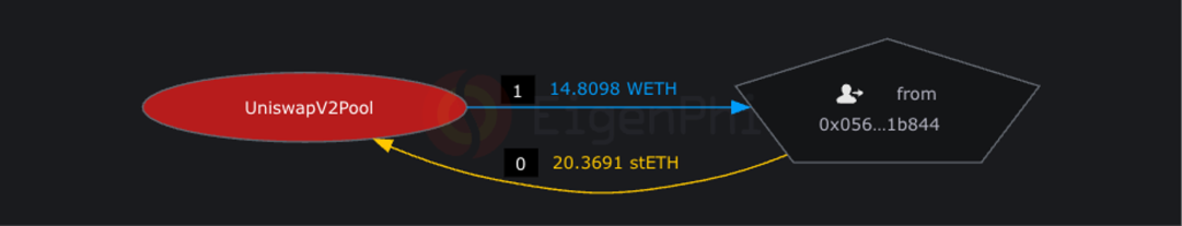 受害者在随后的一笔事务中,通过同一个的 Uniswap v2 池子,将 20.37 个 stETH 换为 14.81 个 WETH。由于攻击者在 Front-run 中提前用大量 stETH 交换为 WETH,在 AMM 曲线中造成偏移,进而拉高受害者 WETH/stETH 的均价。受害者遭遇 MEV 攻击。