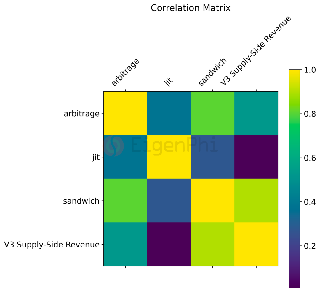 套利、JIT和三明治攻击的利润与 LP 交易手续费收入的相关系数矩阵,来源: Dune, @messari