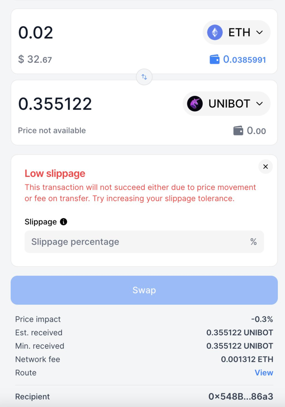 Sushiswap 则推出了自动检测“征税代币”的功能(征税代币是具有交易“税”的代币,即购买、出售或转让代币时的额外费用)。如果UI显示“低滑点:由于价格变动或转账费用,此交易可能无法成功”,如下所示,则可能是征税代币。此时就需要将代币的税收百分比添加到原始容差中。