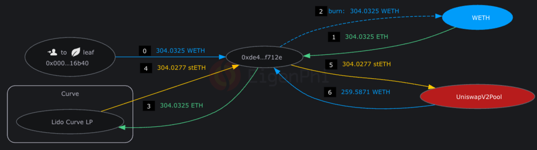Front-run 中,攻击者首先向攻击者 2 转账 304.03 个 WETH,通过 Lido Curve 池子中以极低的滑点换出 304.027 个 stETH。接着将 stETH 在 Uniswap V2: stETH 2 池子中换成 259.59 个 WETH,引发流动性的偏移。(Lido 池子中有 5.6 万个 ETH 与 stETH)