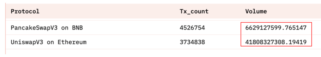 PancakeSwapV3 在 BNB 链和 UniswapV3 在 Ethereum 的交易量大小对比,来源:Dune