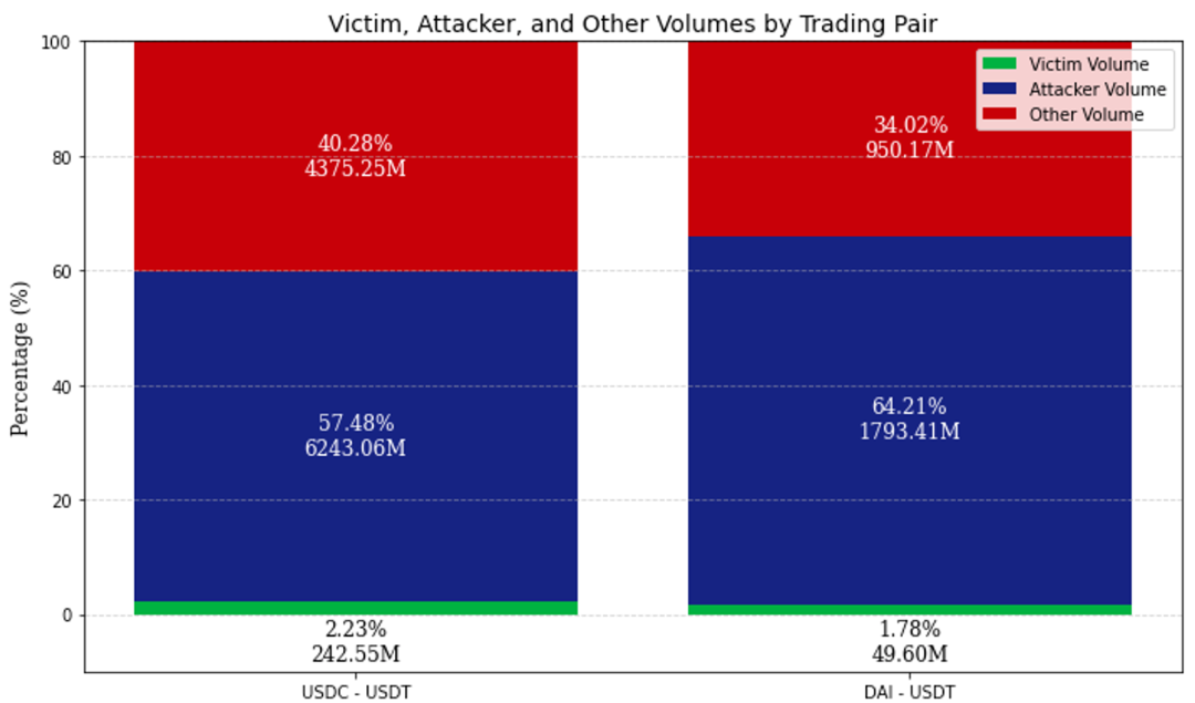 从这两个稳定币对的交易量分布来看,大约 60% 的交易量来自三明治交易。因为三明治攻击需要大额的交易引发流动性偏移,所以尽管 Victim Volume 只占 2% 左右的份额,但为此所做出努力的 Front-run 和 Back-run 为 USDC-USDT 与 DAI-USDT 贡献了 60% 的交易量。