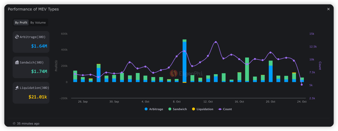 清算(Liquidation)三明治攻击(Sandwich)套利(Arbitrage)在过去 30 天的表现,来源:EigenPhi