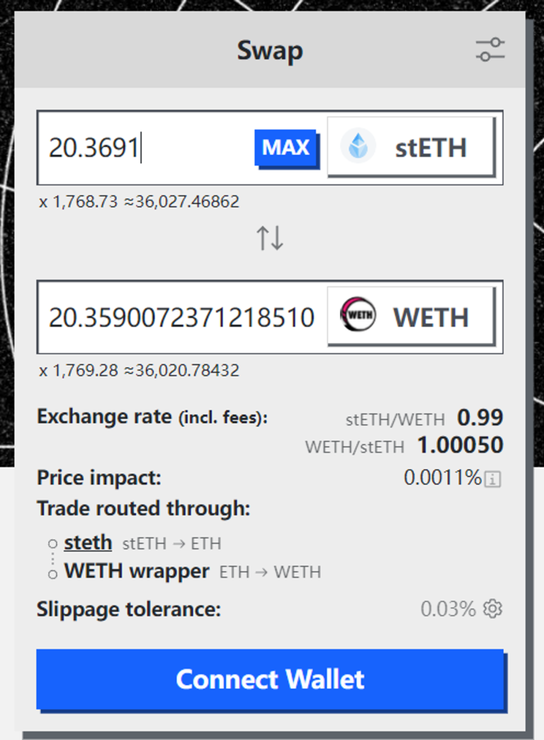 Curve 中 20.3691 stETH 的报价,来源:Curve UI