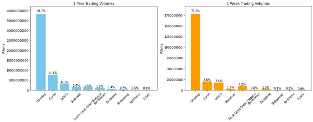 头部 DEX 过去一年与一周的交易量分布,来源:EigenPhi