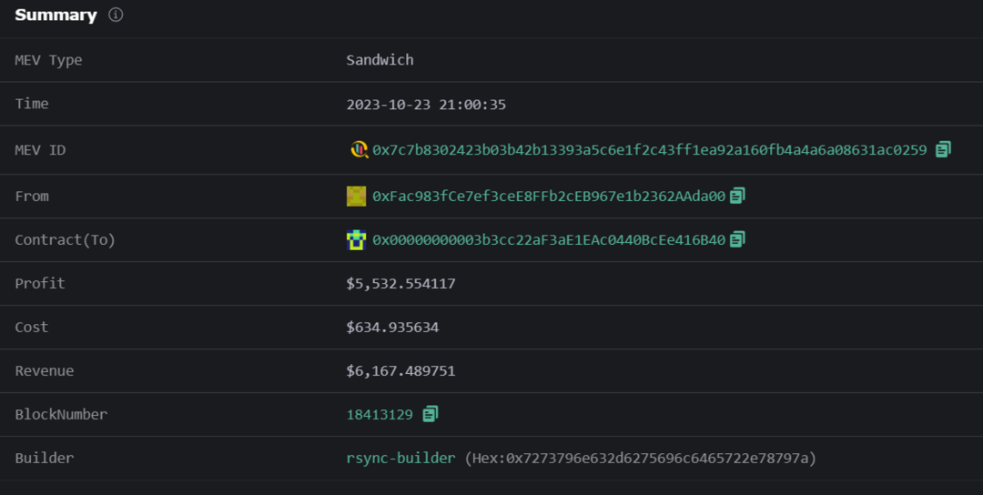 注:这里的攻击者是指 MEV Bot,真正的获利方是与该 Bot 的交互的地址,即 From 中的 0xFac…da00。