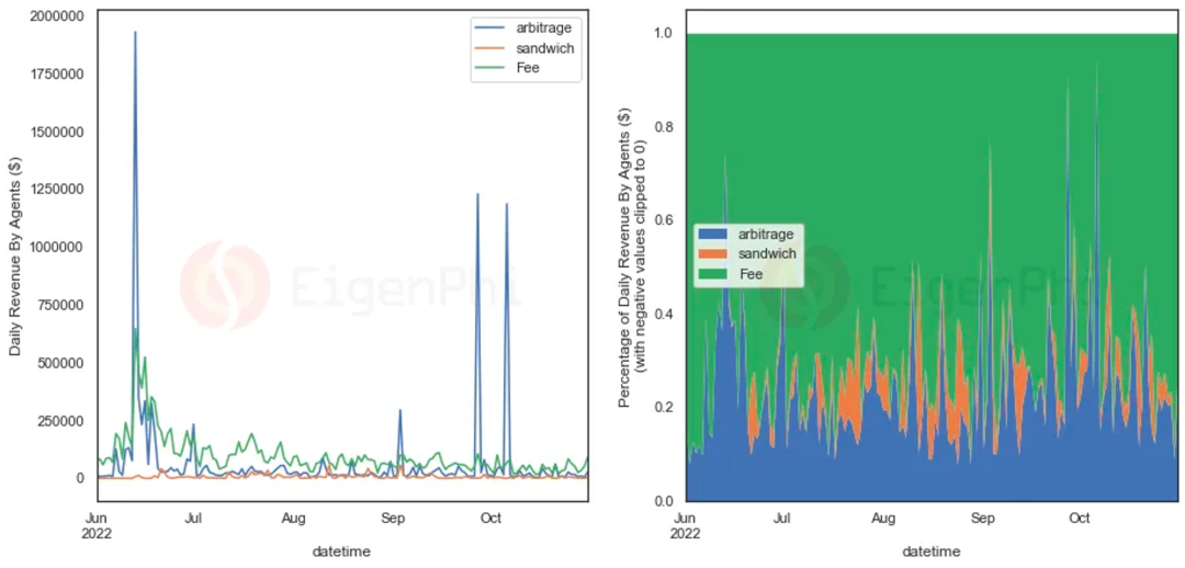 套利、JIT和三明治攻击的利润以及 LP 交易手续费的收入。来源:EigenPhi