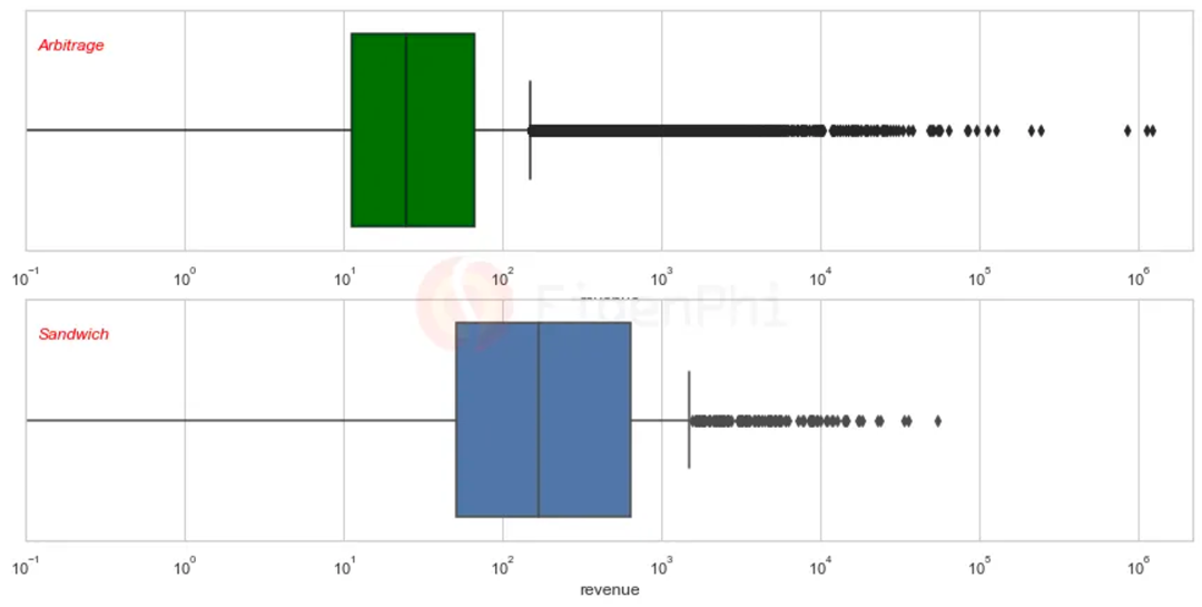套利和三明治的收入分配的箱线图(箱线图中的柱体表示四分之一分位点,中间的线表示中位数),来源:EigenPhi
