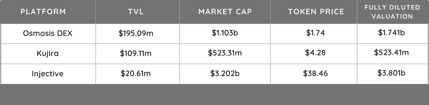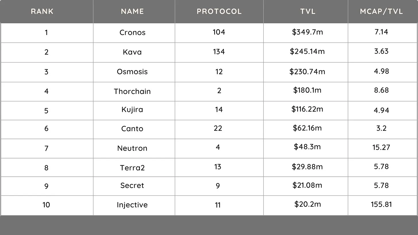 尽管在价格行动和市值增长方面表现令人印象深刻,但 TVL 指标并未显著增长,无法证明估值如此大幅上涨是合理的。让我们使用DefiLlama的简单Mcap/TVL指标,将INJ估值与Cosmos内的流行生态系统进行比较。