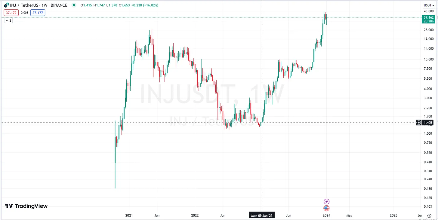 INJ在2023年1月的低点为1.4美元,最高达到了45美元的历史最高价,市值从1.1亿美元激增至惊人的45亿美元。