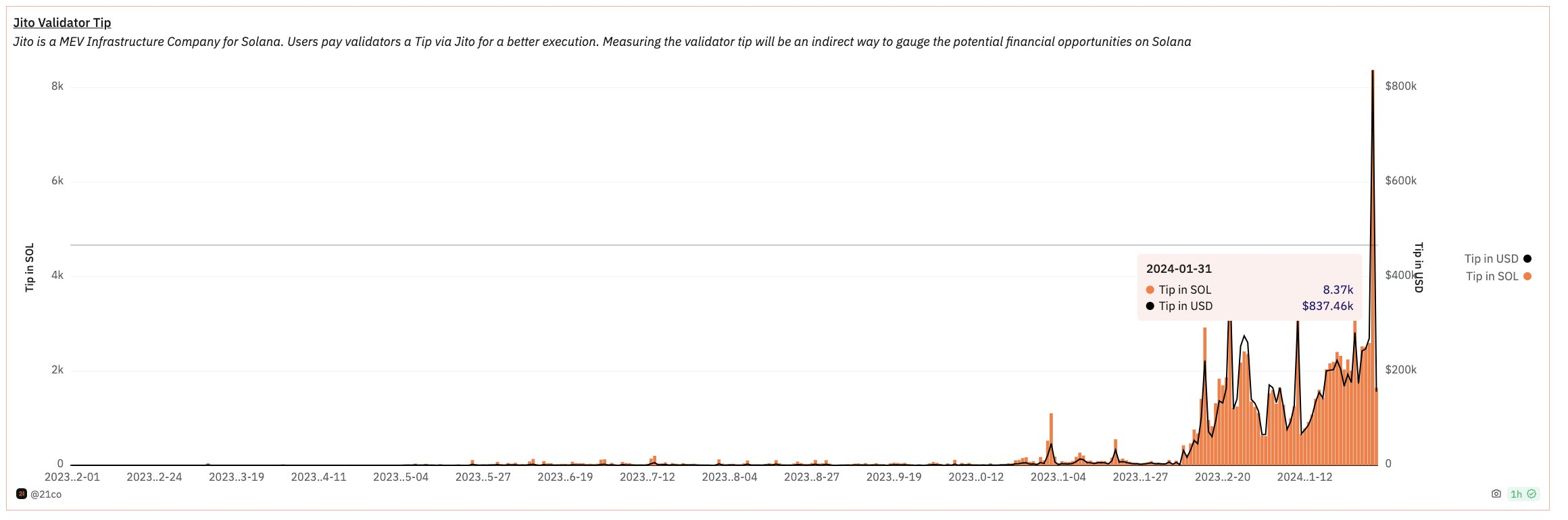 Jito 验证器提示也达到了最高值,单日收到 8370个 SOL(价值83.7 万美元)。