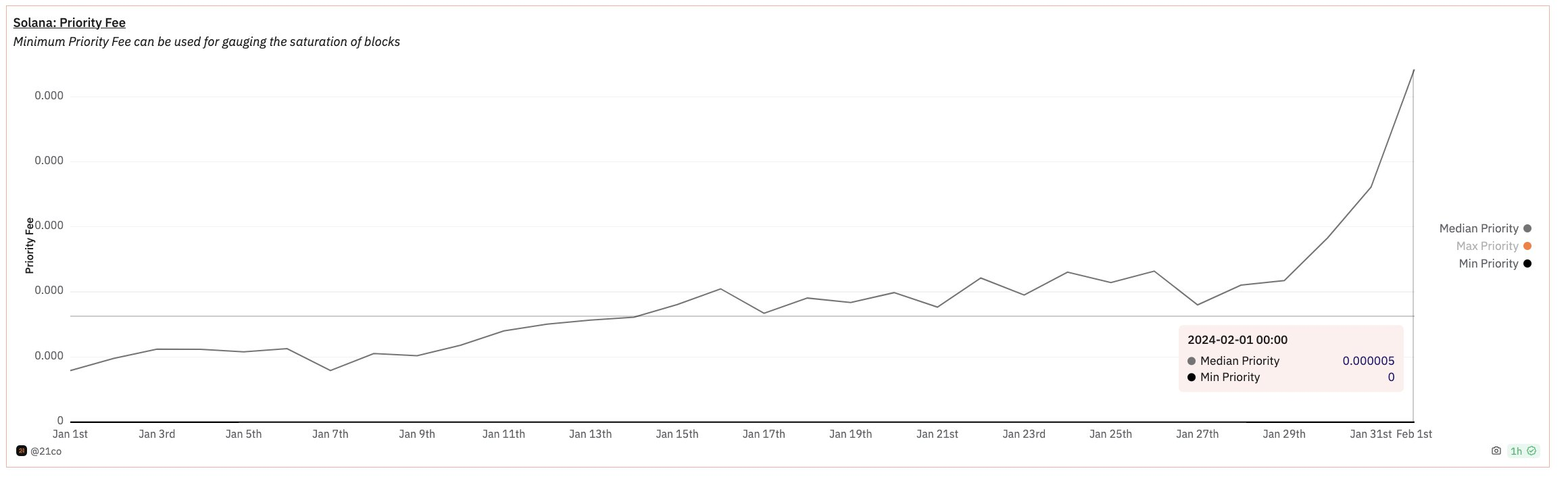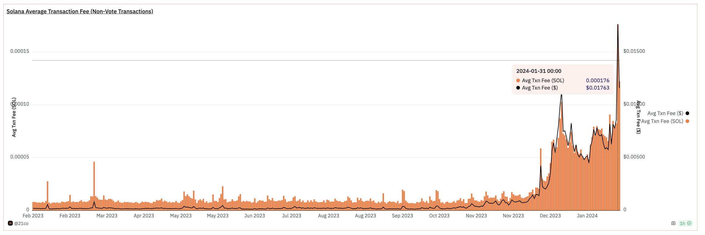 Solana平均交易费用是前一天(1 月 30 日)的 2 倍,但对用户来说,这个交易费用依然很低,每笔交易仅花费约 0.017 美元。