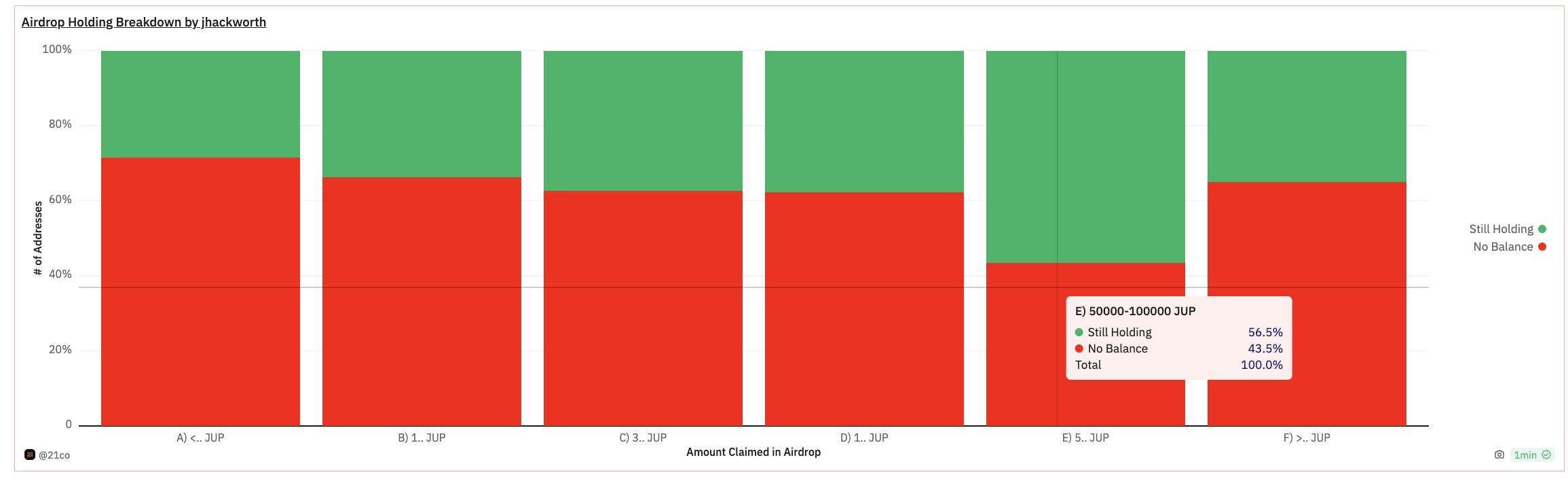空投金额较高的领取者往往仍持有 JUP,而72% 收到少于1000枚JUP 的人不再持有。最忠诚的接收者群体是收到 5万-10万枚 JUP 的钱包。注意:持有人可能将其用于 DeFi 活动。