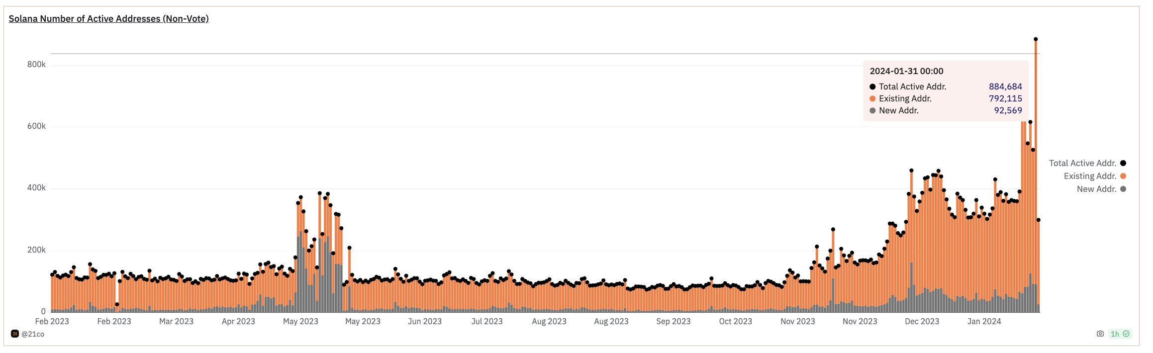 JUP 空投当天Solana活跃地址创一年新高,至少 50% 的活跃钱包在网络上认领 JUP。随着在 Solana 上进行交易的钱包数量增加,我们预计平均交易费用也会增加。