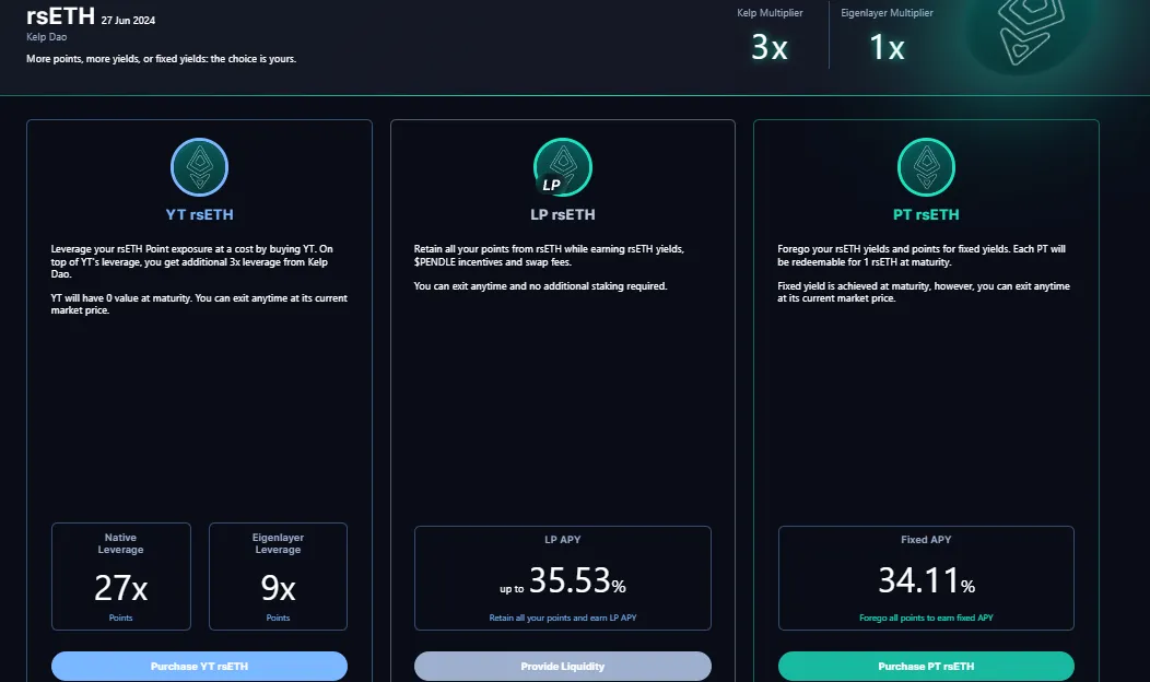 - 如果您相信EigenLayer和Kelp DAO的空投将非常成功:在Pendle购买YT rsETH,以获得多达27倍的Kelp DAO积分和9倍的EigenLayer积分(这是一种高风险策略,因为您只有在这些积分价值相当大的情况下才能赚钱,您实际上是在购买积分)。