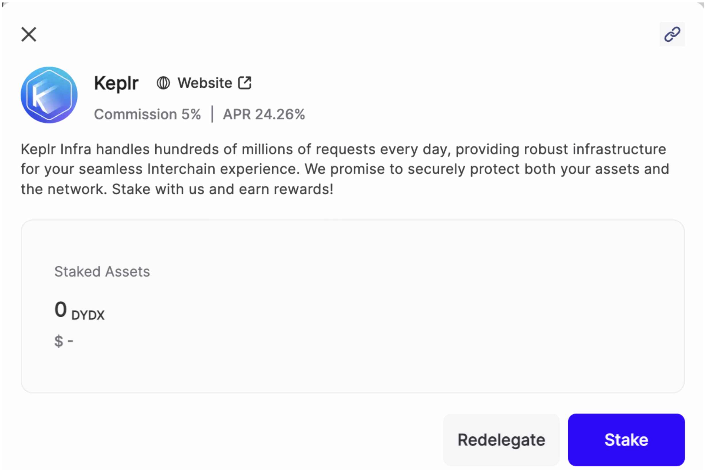 DYDX 代币持有者可以通过 Keplr 将 DYDX 质押在任意活跃的验证节点,可参考该链接查询