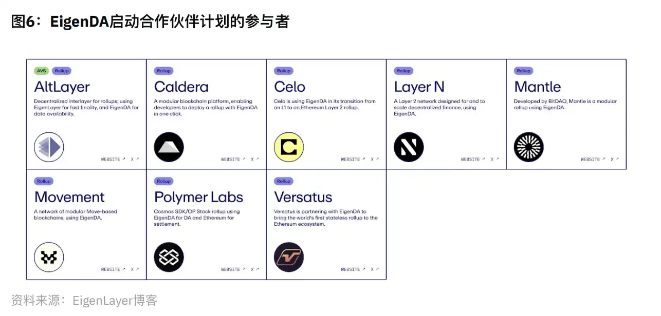 iii. 启动合作伙伴计划:EigenDA 最近还宣布了其启动合作伙伴计划,有⼋家汇总基础设施提供商正在积极集成 EigenDA,将其作为⽤户的 DA 选项。