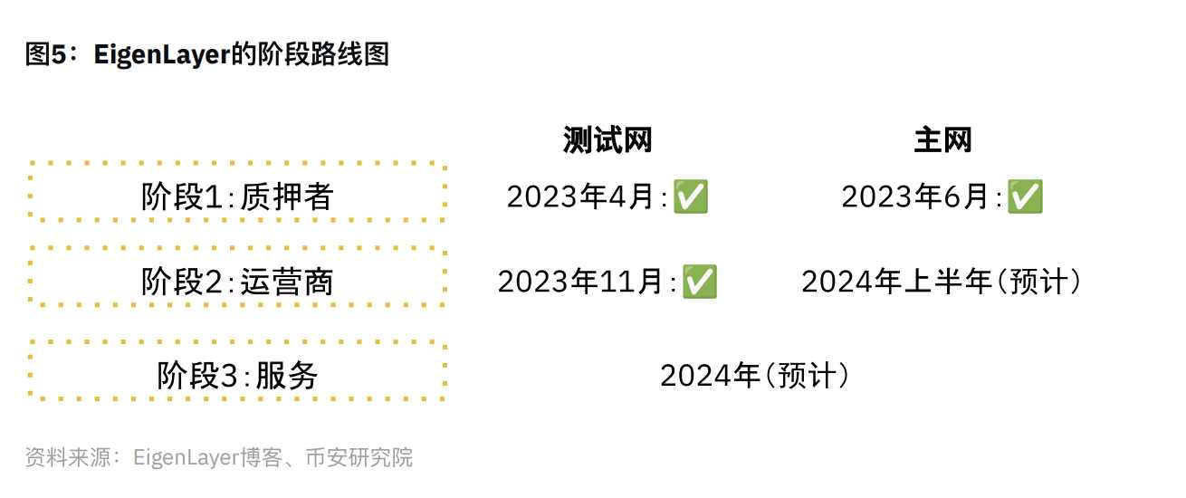 如时间轴部分所示,EigenLayer 预计将在 2024 年下半年完成分阶段主⽹上线的所有三个阶 段。以下是⼀些需要考虑的其他因素: