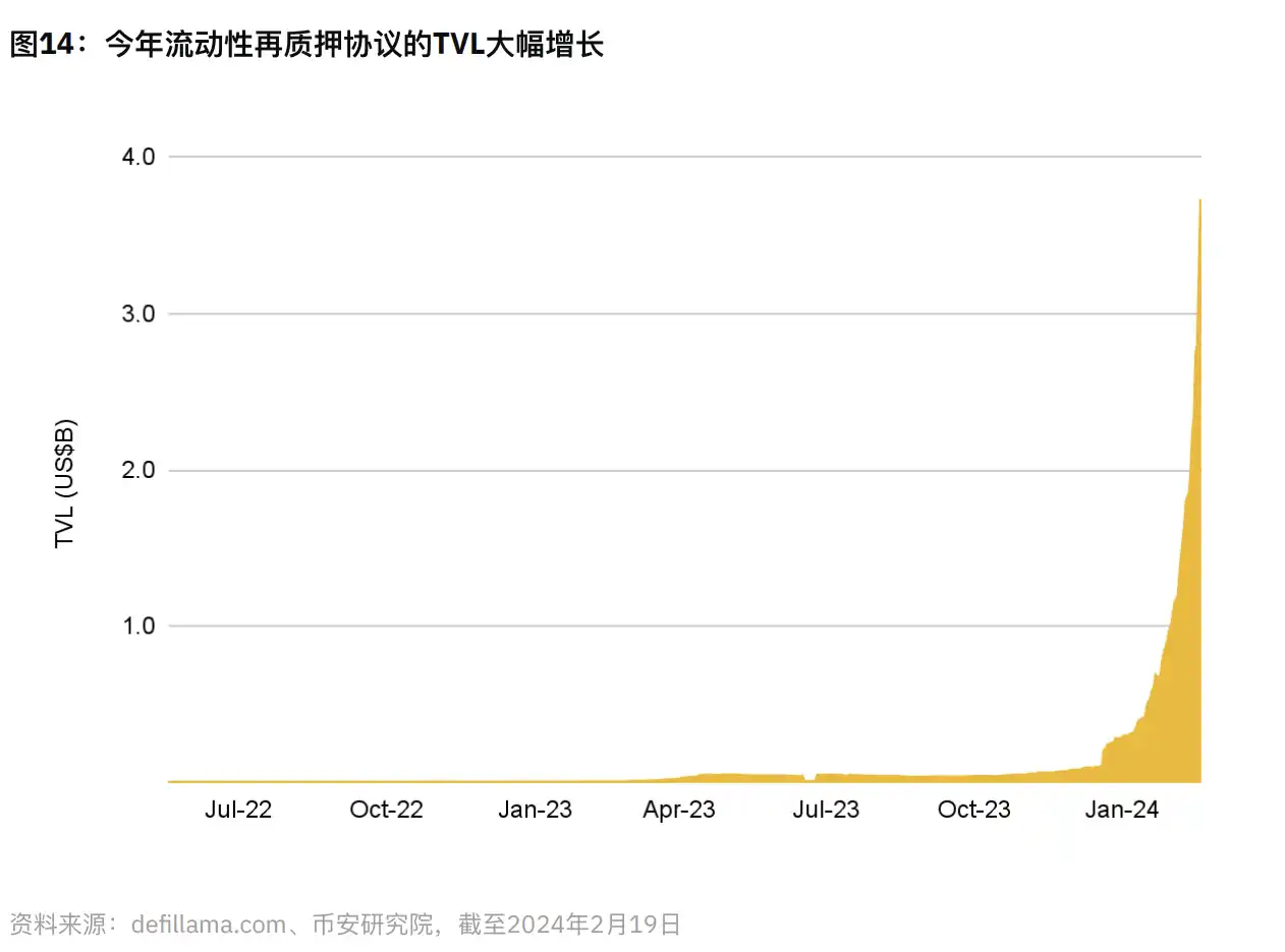 再质押是正在快速增⻓的⼦板块。社区中的许多⼈认为,这⼀系列新的发展将给⽣态系统带来巨变,特别是在基础设施⽅⾯。按照⽬前市场对 EigenLayer 和 Liquid 再质押协议的需求来看,我们可能会经历⼀段有趣的旅程。