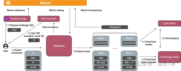 轻客户机承担 DAS 过程以验证数据可用性。此外,在提出阈值数量的区块后,该历史的检查点通过比特币时间戳记录在比特币区块链上。这确保 validator 集可以阻止潜在的远程攻击并支持快速解除绑定。