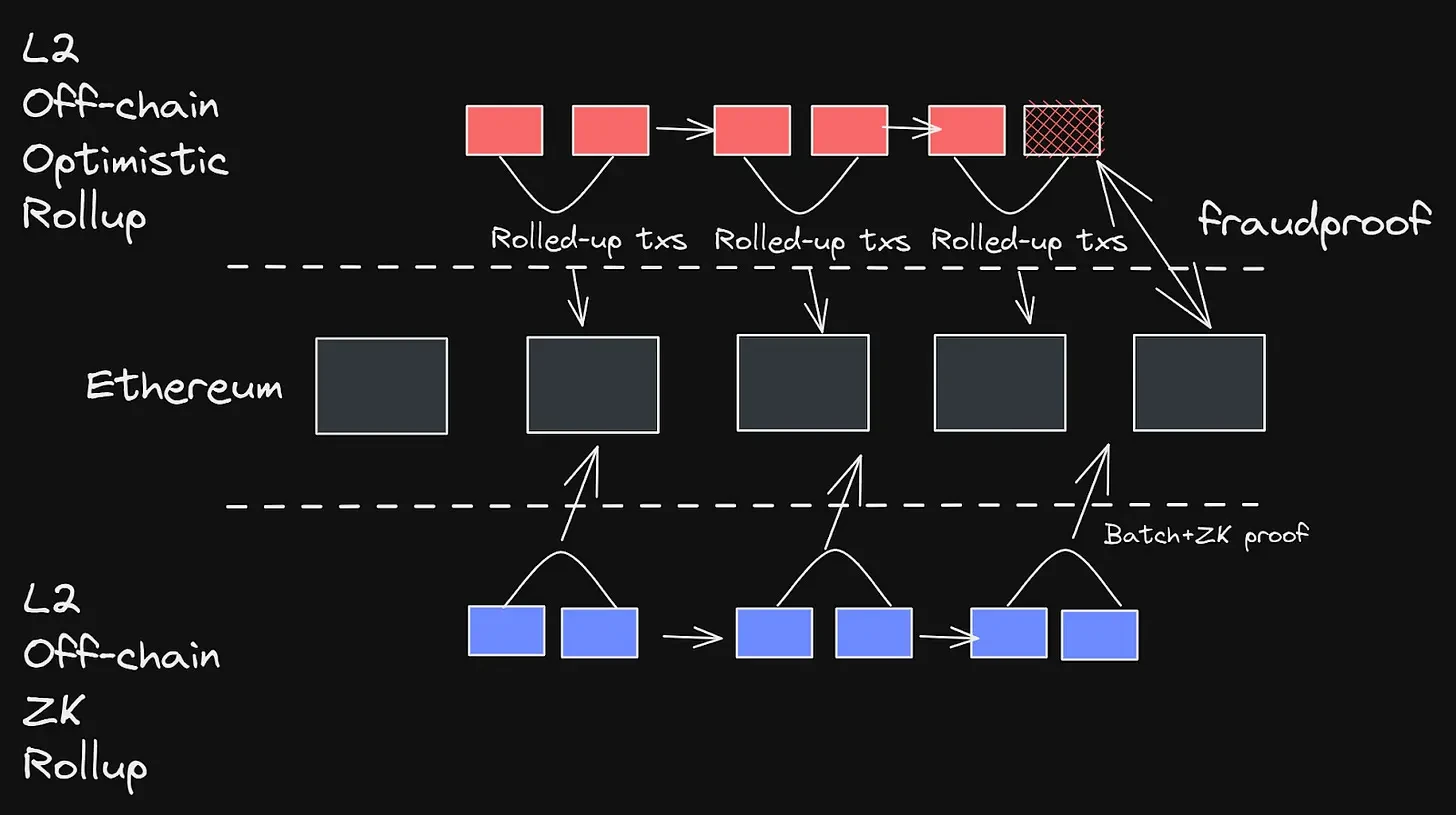 - ZK-Rollup 使用零知识证明来验证打包的交易的正确性,从而确保交易的安全性和隐私性。