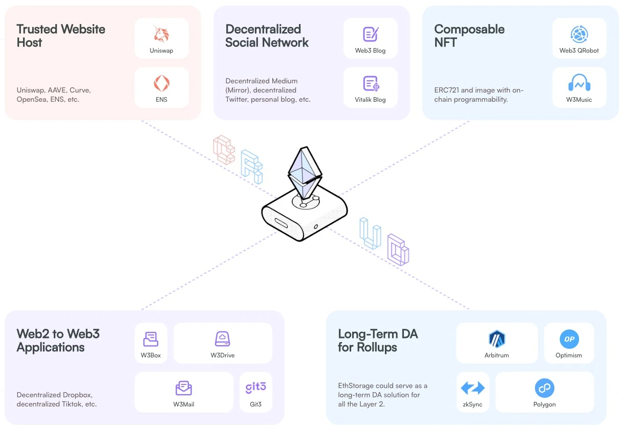 - 基于 DA 层的 Layer 2 去中心化解决方案:EthStorage 是一个模块化的存储层,只要有 EVM,有 DA 来减少存储成本,就可以在任何区块链上运行它(但当前很多 Layer 1 不具备 DA 层),甚至在 Layer 2 上也可以。