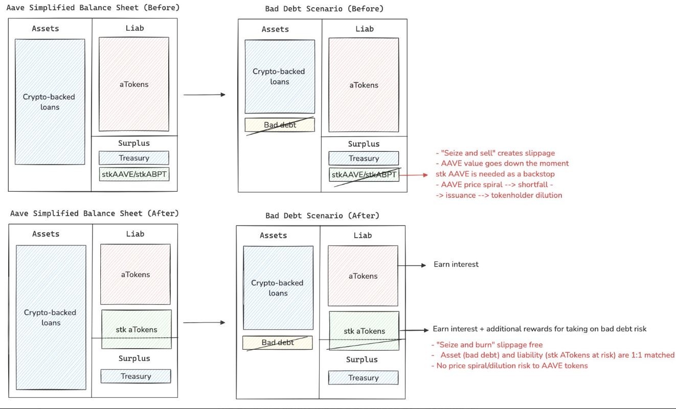 为了更好地理解这些变化,我们来看一下 @sonyasunkim 设计的这张精彩图表,展示了 Aave 的资产负债表和坏账处理的前后变化:
