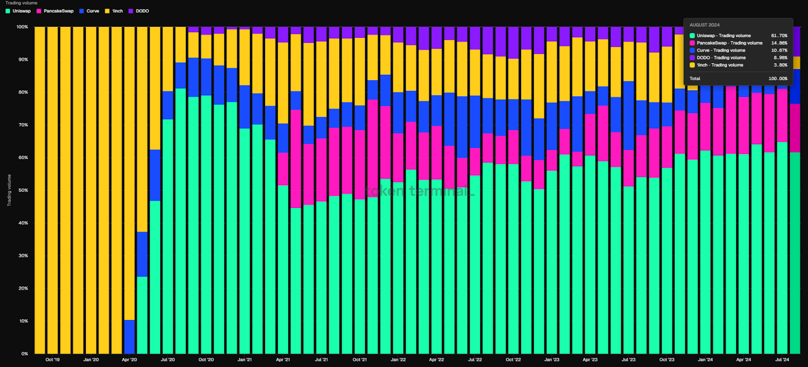 自2020年5月V2版本上线以来,Uniswap在去中心化交易领域的市场份额经历了跌宕起伏的旅程。它曾一度在2020年8月攀至高峰,占据市场近78.4%的份额,却在2021年11月的DEX激烈竞争中跌至36.8%的低谷。然而,如同凤凰涅槃,它不仅重新站稳了脚跟,还以61.7%的市场份额宣告了自己的坚韧与不屈。