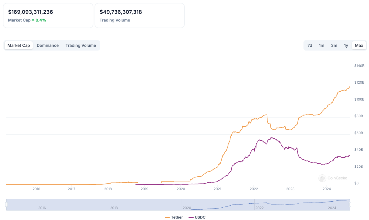 目前稳定币市值为$169B,在全球范围内获得了广泛关注和应用,逐渐从加密货币交易的狭义场景扩展为全球化支付的重要选择。