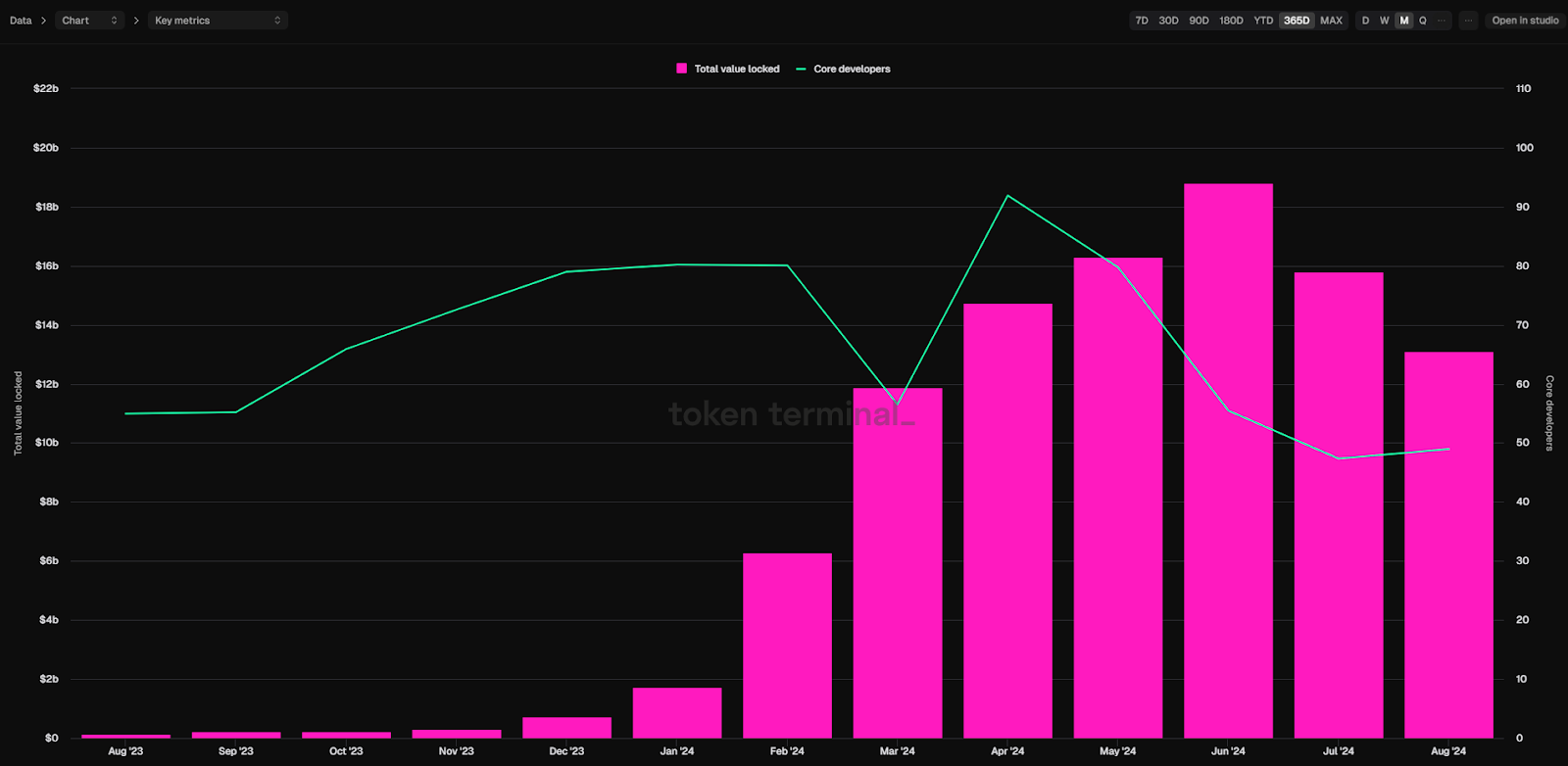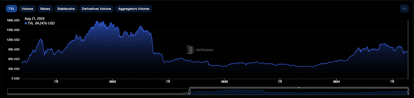 截至2024年8月21日,多链DeFi的总锁定价值(TVL)已降至84.6亿美元。这一数字较2021年12月创下的历史峰值186.8亿美元下降了54.7%,仅比Luna事件引发的市场动荡后的水平高出61%。这种显著的下降趋势,部分可以归因于资产整合的普遍减少,例如以太坊和比特币的封装资产等,同时,资本外流的压缩也对这一下降趋势有所贡献。