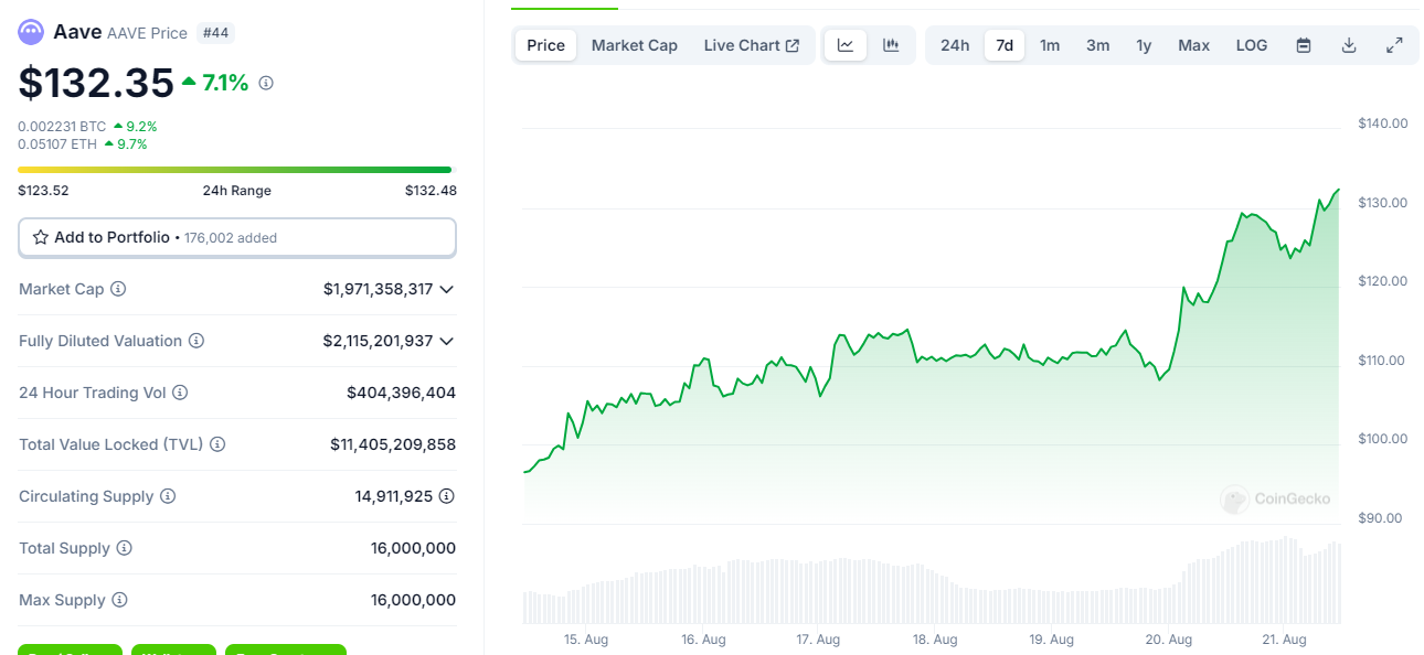 截止撰稿时,AAVE代币价格超过132美金,过去7日涨幅超过50%,已经达到了3月顶峰的水平,关于AAVE为何迎来爆发式增长,详见火星财经此前撰稿: