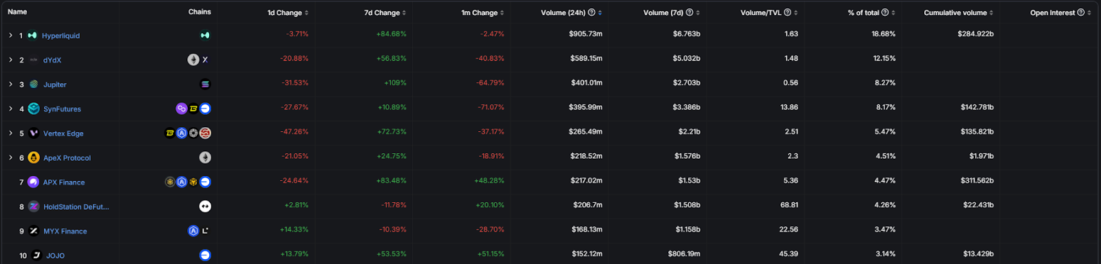 目前SynFutures已上线众多长尾资产交易对,如$YES、$PAC、$DEGEN、$WIF、$MERL等,已突破1500亿美元交易量,日交易量占比稳定在去中心化衍生品平台的8%左右。根据 DeFillma 数据,其日交易量在去中心化衍生品交易所里里排名前四。