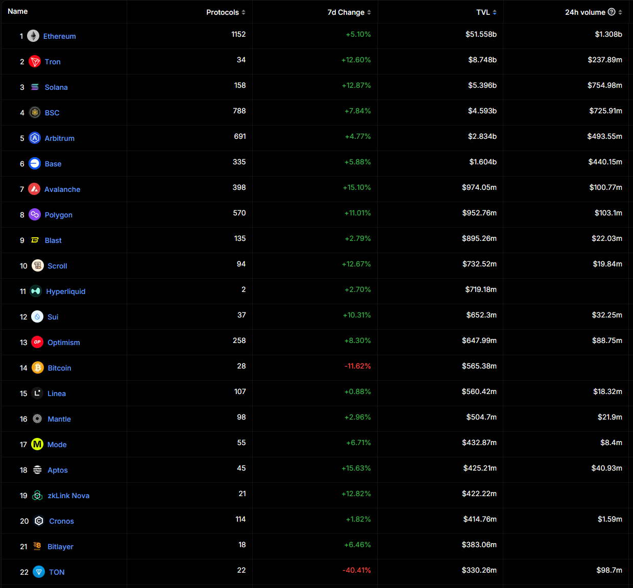 根据DeFiLlama数据,Solana、Avalanche、Scroll、Aptos、zkLink等链的过去七日TVL涨幅均超过12%。其中波场Tron因Sunpump热度,其TVL更是一骑绝尘,目前已超过87亿美金,波场代币TRX更是直逼历史新高。