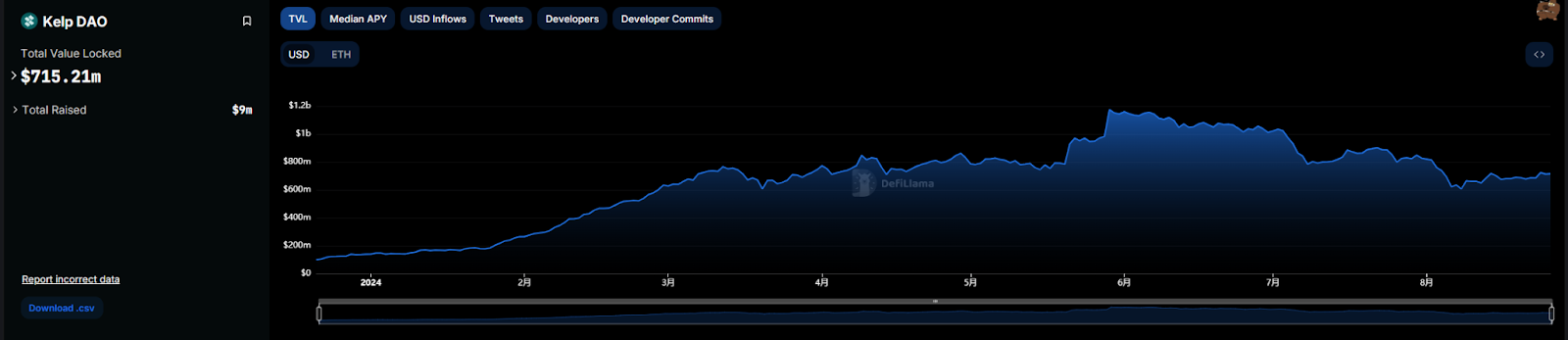 5月 Kelp 宣布以 9000 万美元估值完成 900 万美元代币融资,SCB Limited 和 Laser Digital(野村证券加密货币部门)领投,Bankless Ventures、Hypersphere Ventures、Draper Dragon、DACM、Cypher Capital、GSR、HTX Ventures 和 DWF Ventures 参投。此外,Gitcoin 的 Scott Moore、Frax Finance 的 Sam Kazemian、Aave Chan Initiative 的 Marc Zeller、Jump Crypto 的 Saurabh Sharma 和 AltLayer 的 Amrit Kumar 等天使投资人也参与此轮投资。