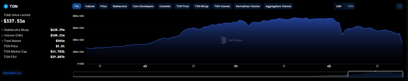TON的总锁仓价值(TVL)也遭受重创,单日跌幅超过39%,与历史高点7.77亿美元相比,下跌幅度近60%。