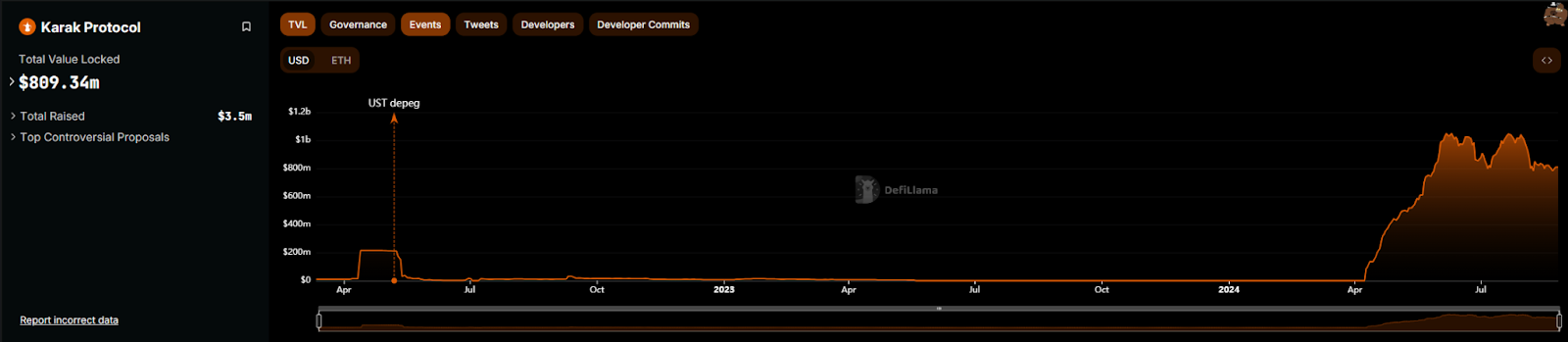 2 月 28 日,Karak 宣布推出早期访问计划,用户可在 Karak 上进行再质押赚取 XP 积分,但反响平平。然而从 4 月 8 日开启私人通道后,Karak 的 TVL 一路暴涨,截至8 月 26 日,Karak 的 TVL为 8.1亿美元。