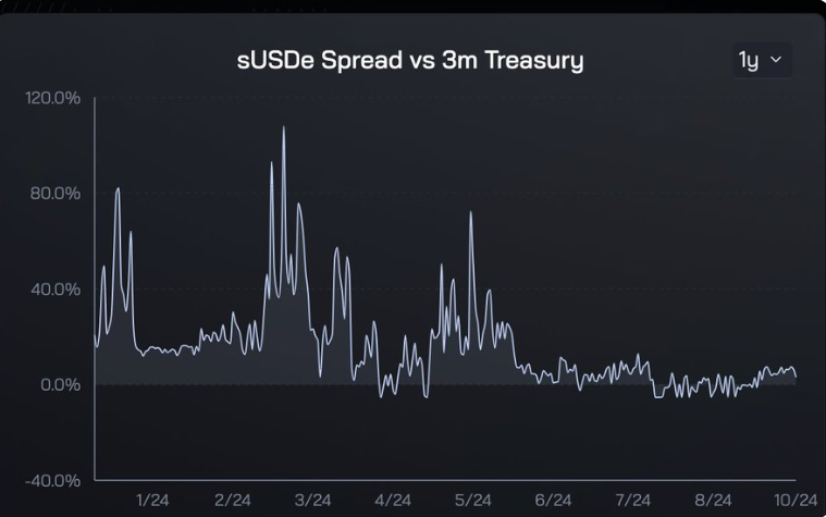 参考上方的两张图表,很明显,市场对 USDe 的需求对与美国国债相比的收益溢价高度敏感。在前6个月的高收益溢价期间,USDe 的供应量飙升。随着溢价的下降,USDe 的需求也自然减弱了。根据这一历史数据,我有信心,收益溢价的回升将导致 USDe 增长的重新加速。重要的是,这种顺风因素对大多数市场参与者来说既容易理解又具有吸引力。