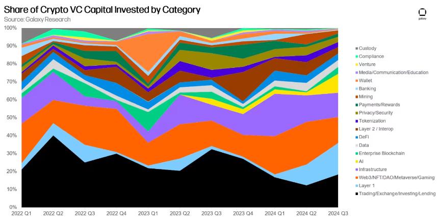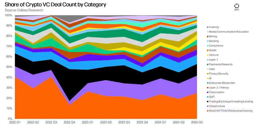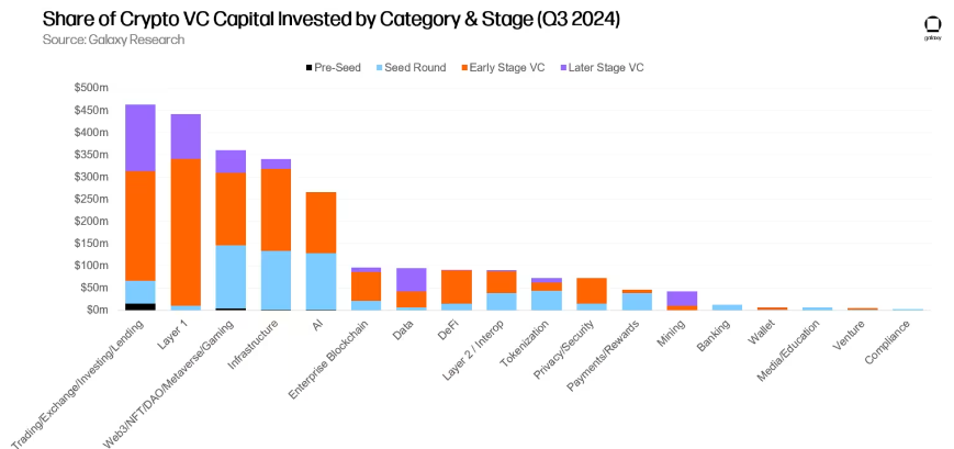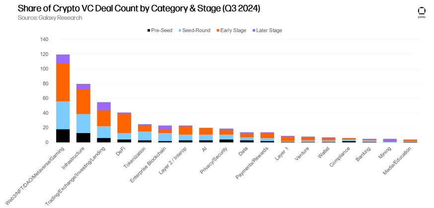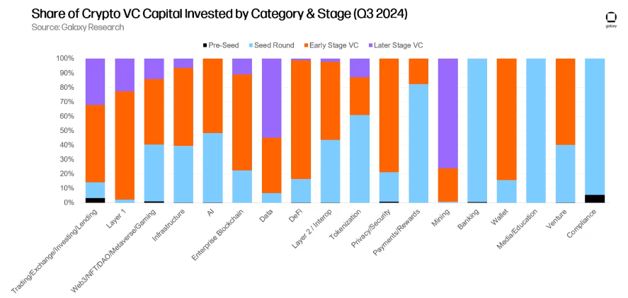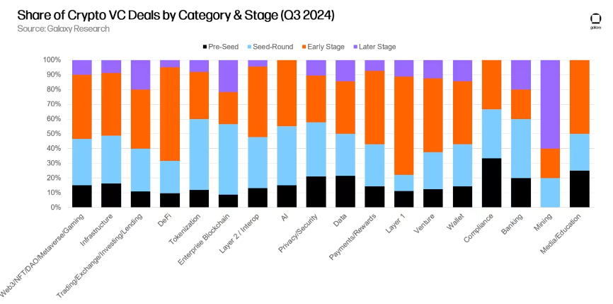 将资本投资和交易数量按类别和阶段进行细分,可以更清楚地了解每个类别中公司筹集资金的类型。在2024年第三季度,Layer 1、企业区块链和DeFi的大部分资金流向了早期阶段的公司和项目。相比之下,投资于挖矿领域的加密风投资金有很大一部分流向了后期阶段的公司。