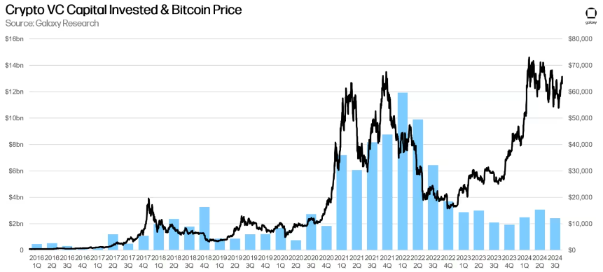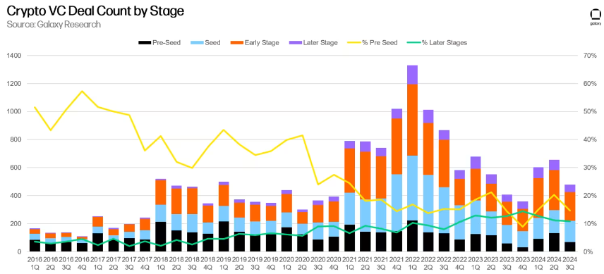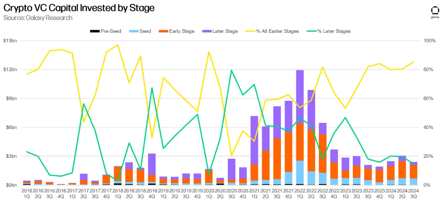 在2024年第三季度,85%的风险投资流向了早期阶段的公司,而15%流向了后期阶段的公司。加密本土基金可能仍能利用几年前大规模筹集的资金储备,并通过与企业家的接触,发现从加密行业中重新燃起的热情中涌现的新交易。
