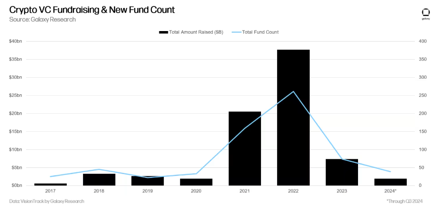 按年率计算,2024 年有望成为自 2020 年以来加密风险投资筹款最疲软的一年,仅有 39 只新基金筹集 19.5 亿美元,远低于 2021-2022 年的狂热水平。