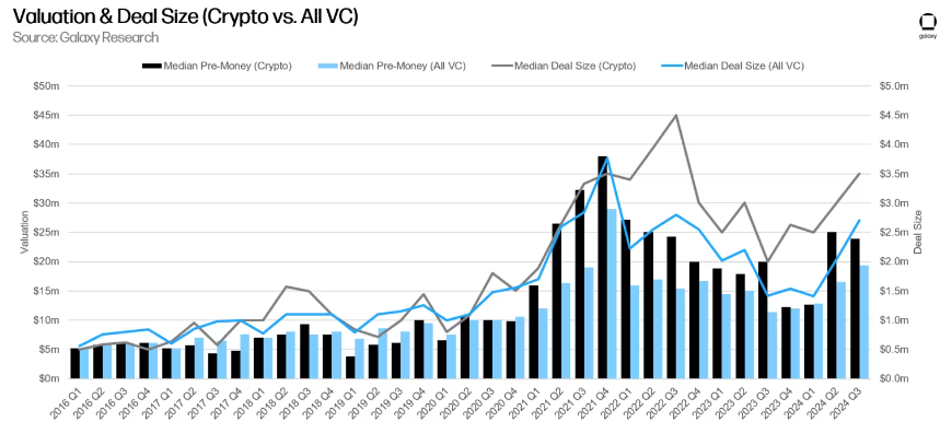 风险投资的中位估值在第二季度和第三季度有所上升,而加密领域的交易估值增长速度快于整个风险投资行业。2024年第三季度交易的中位估值为2380万美元,略低于第二季度的2500万美元。