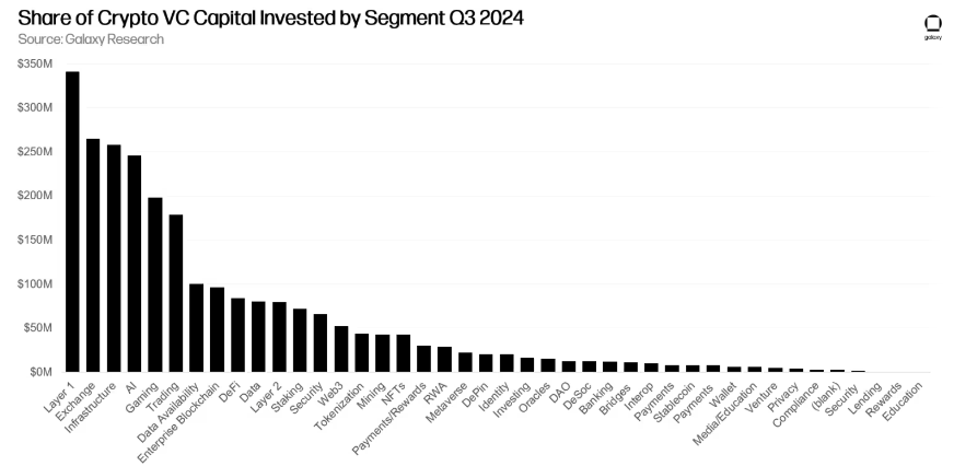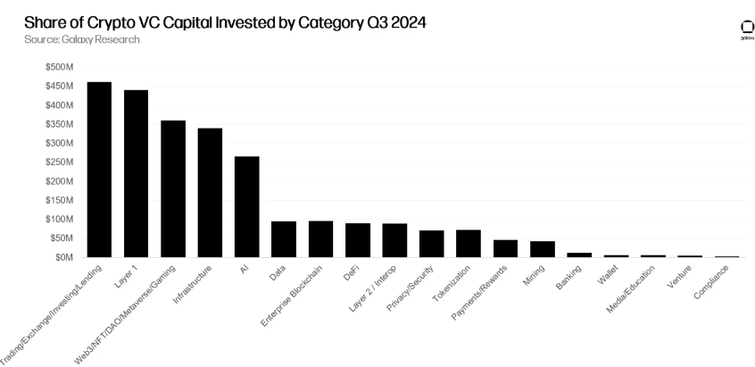 2024年第三季度,构建AI服务的加密初创企业的风投资金环比增长了5倍。Sentient、CeTi和Sahara AI在AI加密项目中的风投分配中贡献显著,分别筹集了8500万美元、6000万美元和4300万美元。交易/交易所/投资/借贷和Layer 1加密项目的风投资金也环比增长了50%。相比之下,Web3/NFT/DAO/元宇宙/游戏项目的加密风投资金减少了39%,是所有类别中环比降幅最大的类别。