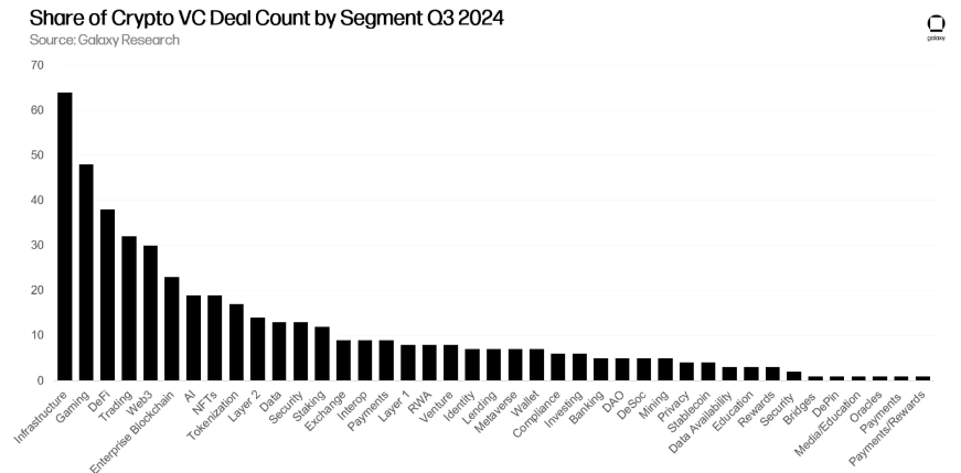 将上述较大类别进一步细分,构建加密基础设施的项目和公司在所有领域中交易数量最高,共完成了64笔交易。游戏相关的加密公司紧随其后,完成了48笔交易,而DeFi相关的加密公司在2024年第三季度完成了38笔交易。